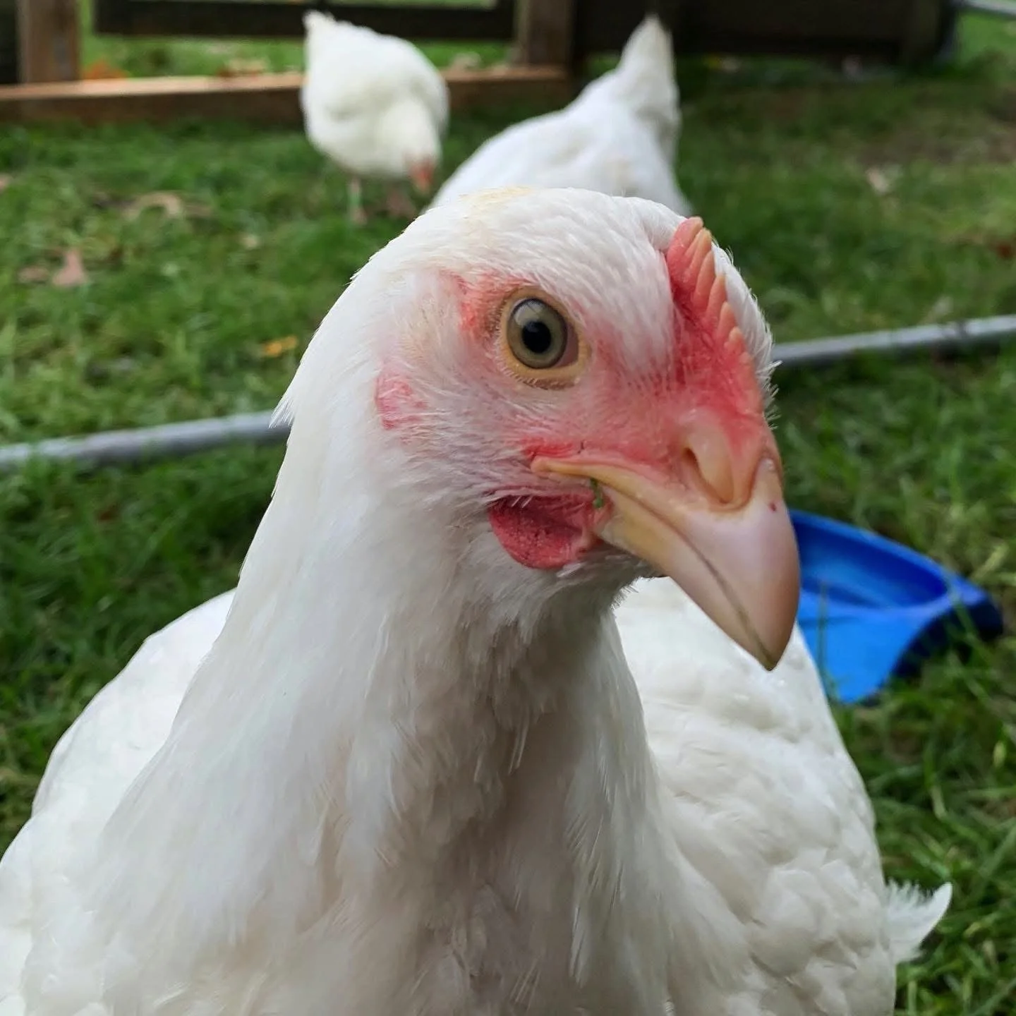 Rachel came from the egg farm closing as well. When they originally arrived to us, they were emaciated and extremely terrified. They have sense come out of their shells a bit!